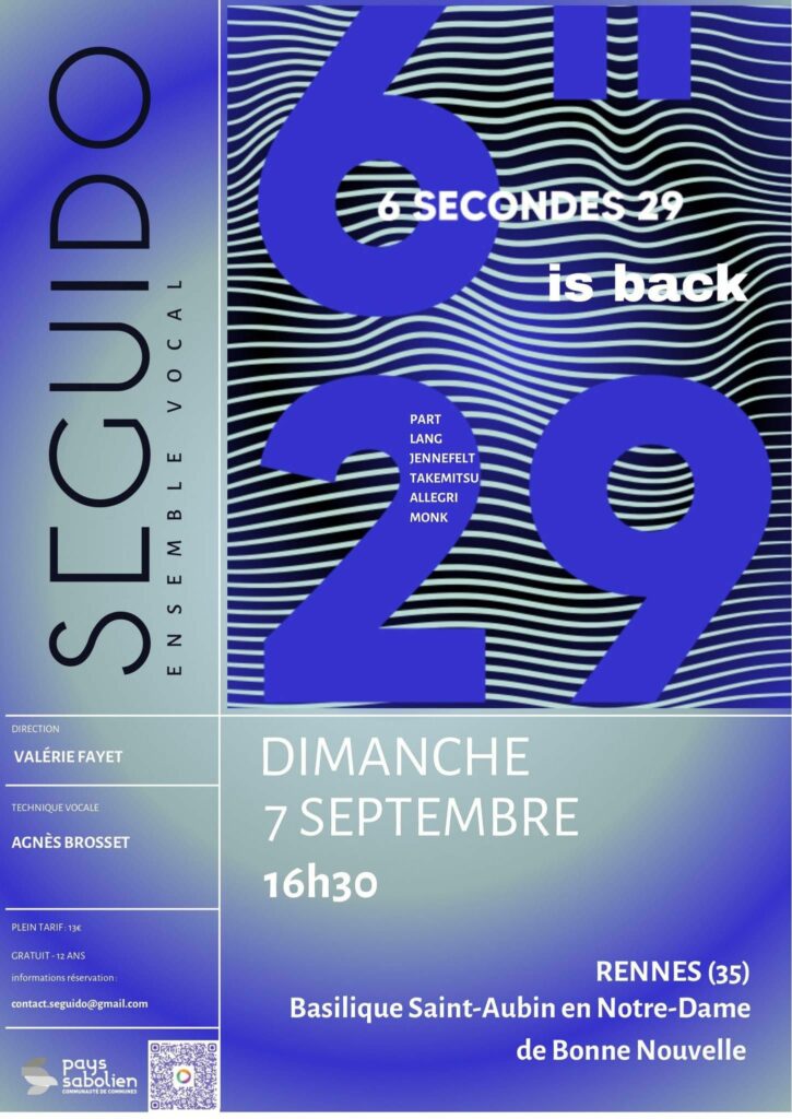 L’Ensemble Vocal Seguido, créé en 2011 par d’anciens chanteurs de chœurs de jeunes, cultive la pratique chorale au plus haut niveau sous la direction de Valérie Fayet, avec l’accompagnement vocal d’Agnès Brosset. Spécialisé dans le répertoire a cappella des XXᵉ et XXIᵉ siècles, il se produit régulièrement dans le Grand Ouest (Folles Journées, Festival de la Voix…). Engagé dans la création contemporaine, il a notamment collaboré avec le compositeur Martin Moulin. En résidence à Sablé-sur-Sarthe, l’ensemble mène également des actions pédagogiques soutenues par la communauté de communes.