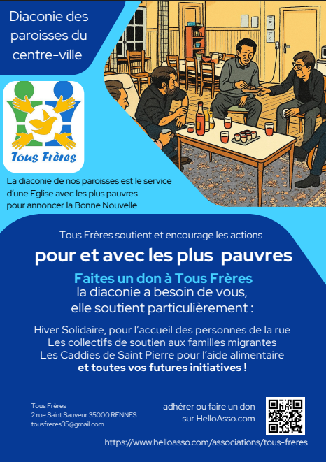 Au cœur des paroisses du centre-ville, la diaconie s’engage quotidiennement pour faire vivre une Église proche des plus pauvres. À travers l’association Tous Frères, cet engagement prend forme de manière concrète, chaleureuse et fraternelle, notamment grâce à l’implication de nombreux bénévoles.