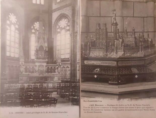 La basilique Saint-Aubin – Notre-Dame de Bonne Nouvelle est le fruit d’un engagement collectif des Rennais envers la Vierge Marie. En 1632, face à une épidémie de peste dévastatrice, la ville de Rennes fit le vœu de construire un sanctuaire en l’honneur de la Vierge de Bonne Nouvelle, implorant sa protection. Ce vœu se concrétisa par la donation d’une maquette en argent massif représentant la ville, placée en ex-voto à Notre-Dame de Bonne Nouvelle. Ce geste marqua le début d’une dévotion populaire qui perdure encore aujourd’hui.